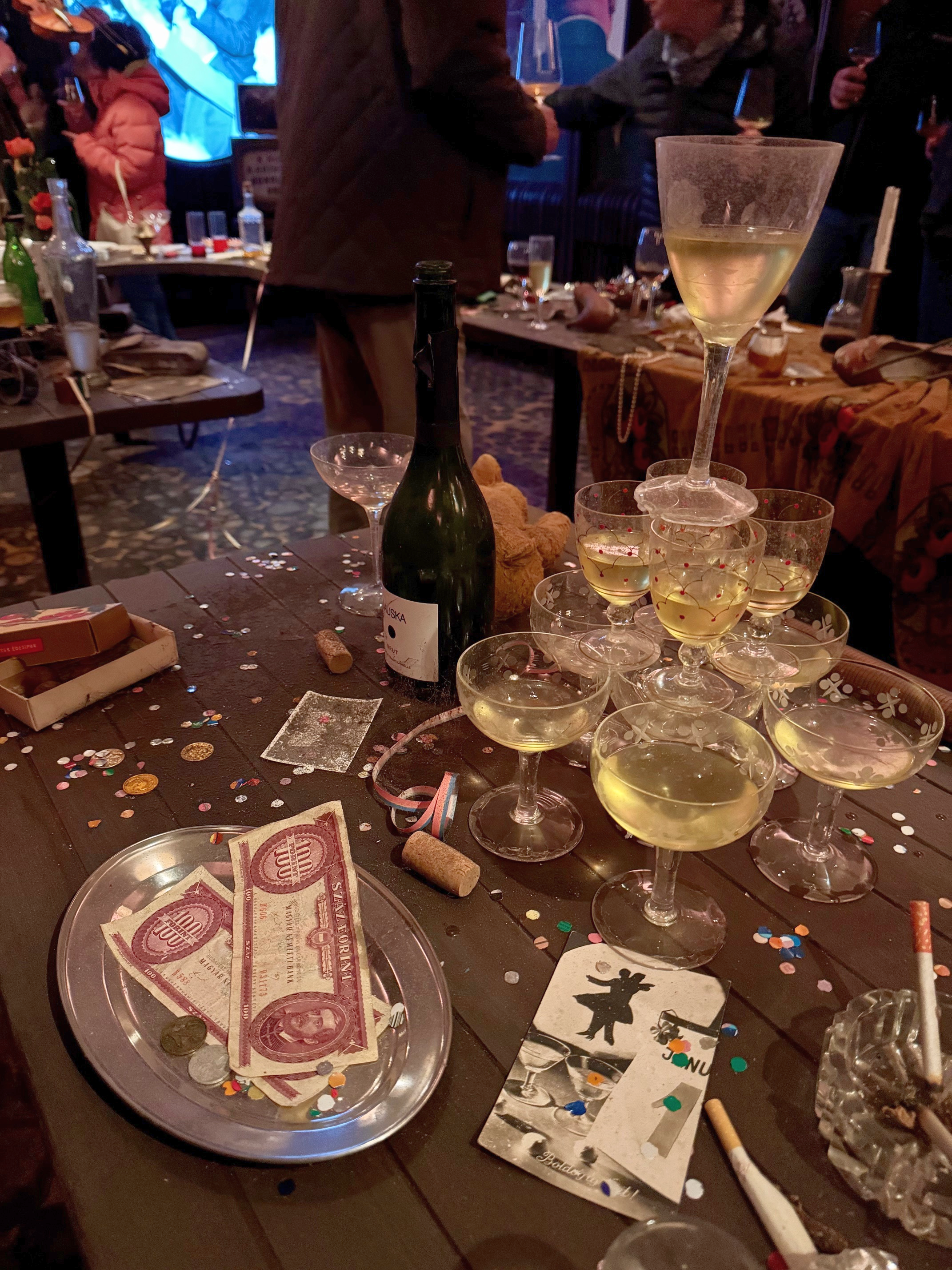 Ahogy belépek ebbe a különös térbe, olyan érzésem van, mintha valaki csak egy pillanatra hagyta volna ott a bulit. Papírtrombiták, női cipők, kártyák, pezsgőspoharak – a kirobbanó hangulat szinte tapintható. A falon még egy ikonikus „Tovarisi, konyec” plakát is visszaköszön, mintha csak emlékeztetne: itt nemcsak ünnepeltek, hanem korszakok értek véget.
